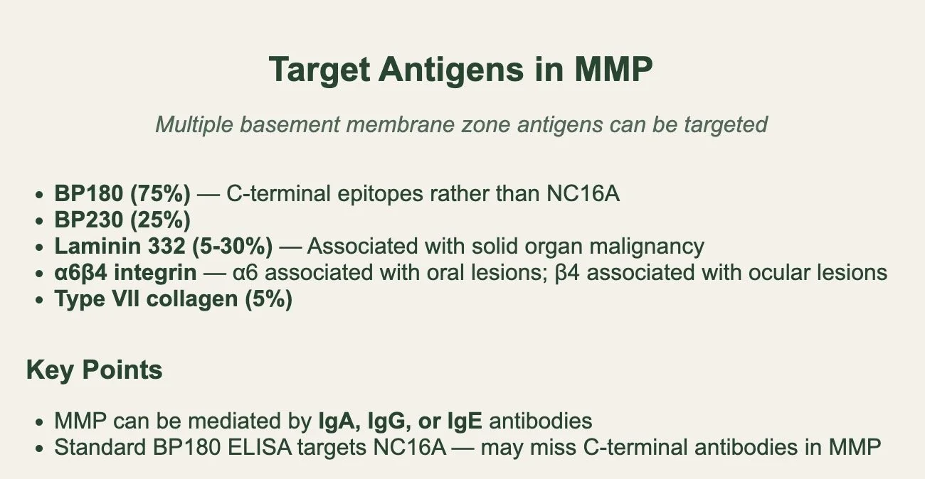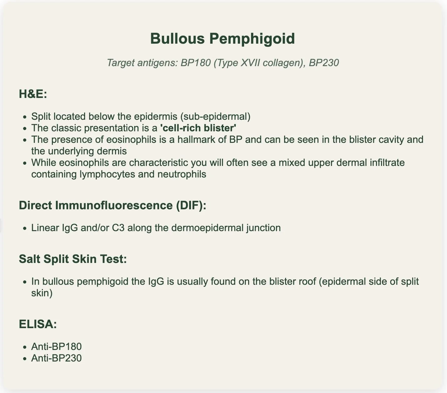 Helps differentiate bullous pemphigoid from other sub-epidermal blistering conditions.