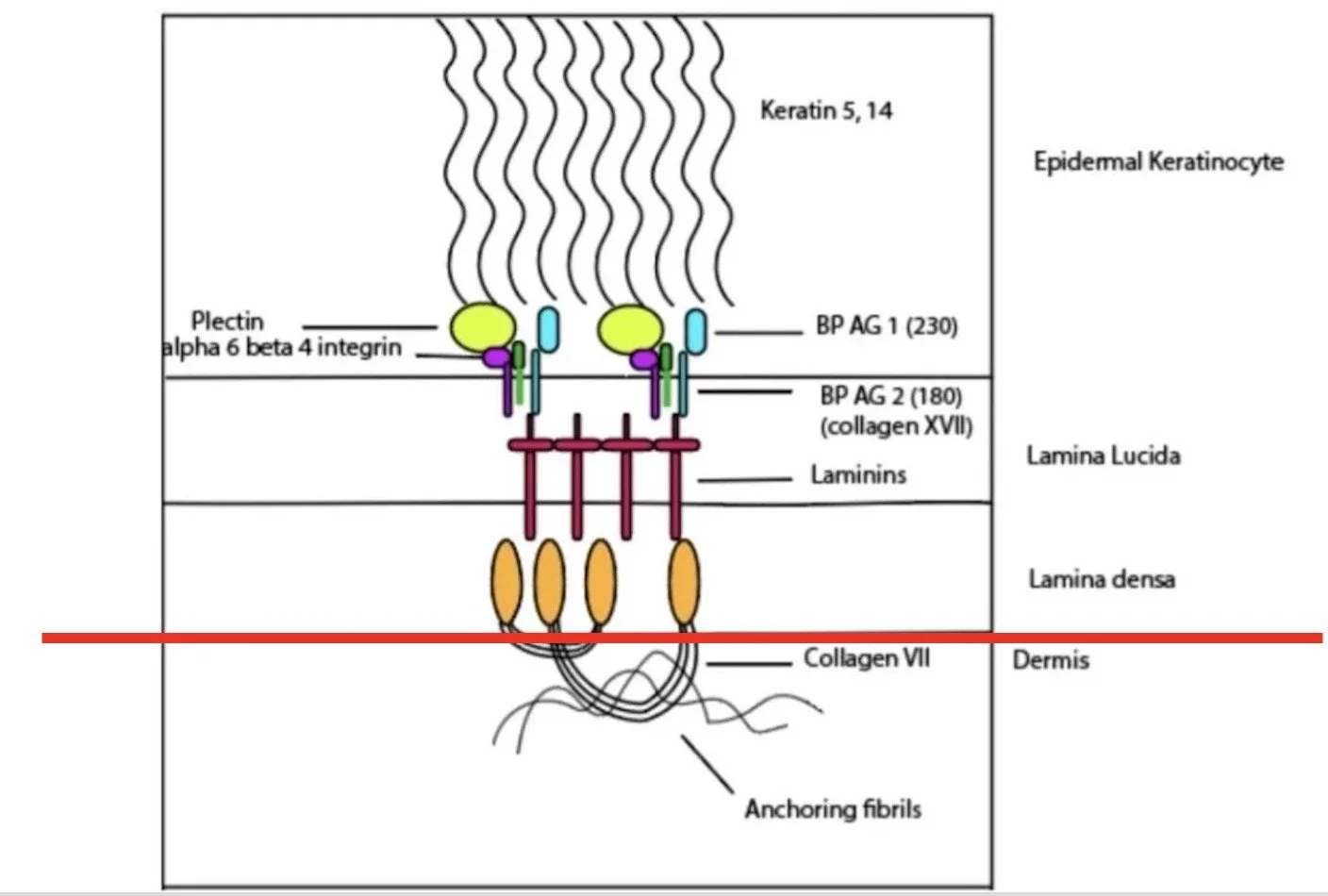 The hemidesmosomes are the collection of proteins involved in keeping the basal keratinocytes attached to the extracellular matrix in the dermis